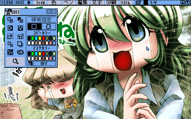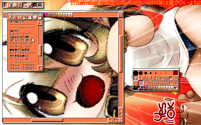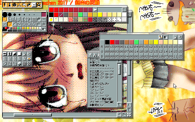 ![【デジタル8色アナログ16色】ZIM形式、ALG形式生成のためのZ's STAFF kid98の画面、実はkidも640×400以上のお絵描きが、メニューの[▲][▼]で動かしながら描くコトが出来ます(^_^;)、ただ全景が見えないので、こんな感じの画面があるのでして…(^_^;)](scrawl2017/sat1jly2017_kid.png)