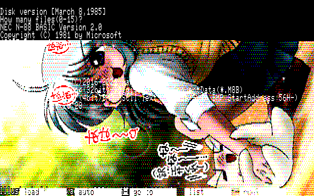 あぁ、あと、8色の方でJKのセリフ色をちょっと…(^_^;)ピンクっぽくするのに、16色は赤白の市松だったのですが、8色でも同じように市松にすると読めなくなってしまうとゆー事態が…ヽ(^.^;)丿文字を太くしても良かったのですが、それだと描き直しなので…結局単色にしておりますヽ(^.^;)丿多分横長(640×400)だったら起きなかったと思います…今回は縦長なので、ドットが横方向に長いのでねーヽ(^.^;)丿