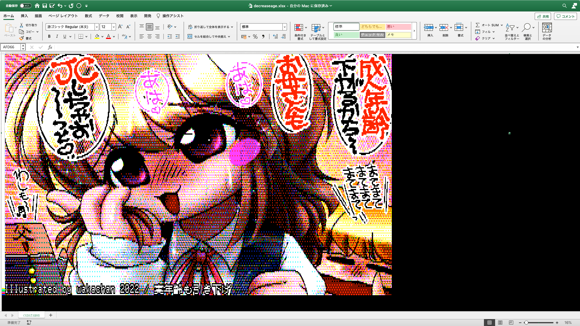 ![【デジタル8色アナログ16色】アナログ16色(16colors Dithering)版、去年の大晦日に試してみた方法に、ちょっと応用を加えて減色処理をしてみたトコロ、イイ具合のタイルが出てきてくれましたっ!\(^o^)/これからも試してってみて、方法確立出来るといいがなぁ…(^_^;) [MAG形式][ZIM形式]](../cglib/uoaw2022/decreaseage.png)